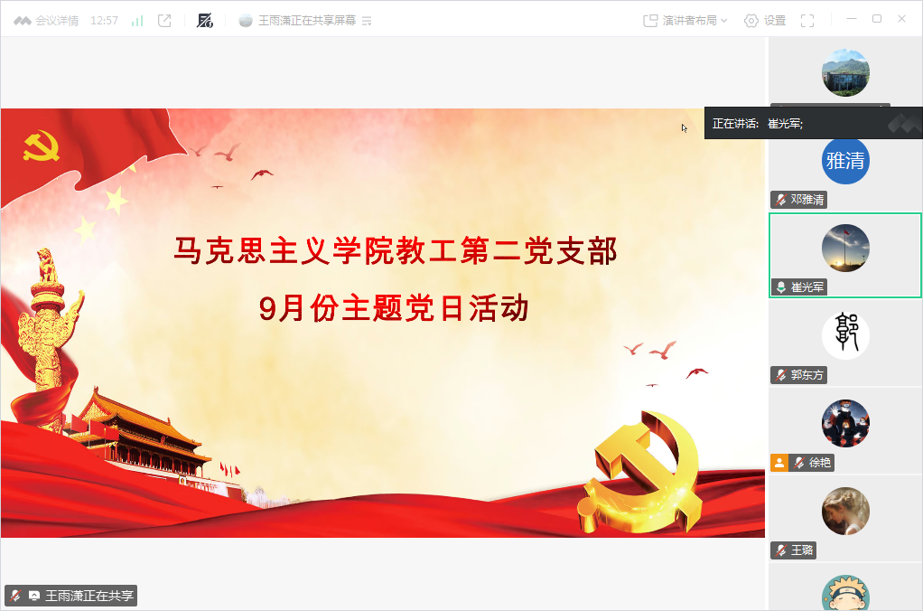 2025年9月24日,太阳成集团tyc122ccvip教工第二党支部召开9月主题党日活动。本次党日活动主题是“弘扬伟大抗战精神 踔厉奋发勇毅前行”。会议由支部书记邹慧同志主持,全体党员参加。