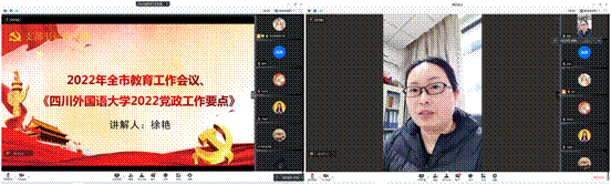 紧接着,研究生党支部书记徐艳老师为大家主讲专题党课——《四川外国语大学2022党政工作要点》《中国共产党普通高等学校基层组织工作条例》。她从大家共同经历的疫情防控工作、思想政治工作中的一件件小事出发,以小见大,为大家传达解读了2022年全市教育工作会议、四川外国语大学2022 年党政工作要点的重要精神和党内规章制度,要求党员同志们要积极主动学习好、落实好相关政策和文件,不断克服困难,发挥先锋模范作用。