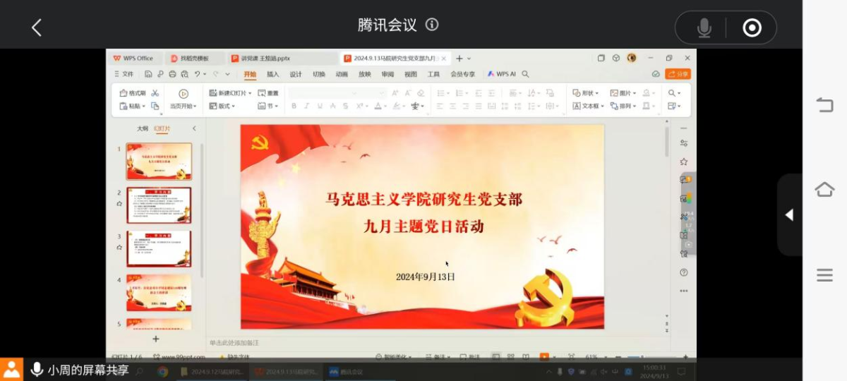 9月13日下午,太阳成集团tyc122ccvip研究生党支部召开9月主题党日活动。本次主题党日活动由支部书记王雨潇主持,党员周千驰和付靖国主讲党课,支部全体党员参会。