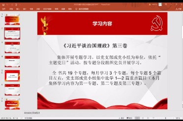 本次的主题党日活动一共分为了三个学习环节,首先是学习《习近平谈治国理政》第三卷第一专题、第二专题、第三专题,再是学习《党支部工作条例》第7章、第8章和《中国共产党纪律处分条例》,最后是学习党史、新中国史、改革开放史、社会主义发展史。
