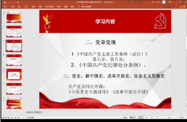 在第二个环节中,徐艳同志领学了《党支部工作条例》第7章、第8章内容和《中国共产党纪律处分条例》,并针对其中重要的条例进行了阐述,让支部同志们更加了解党支部工作所应遵循的条款条例。