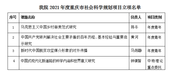 9月17日下午,重庆市社会科学规划办公室公布了《2021年度重庆市社会科学规划项目立项名单》,学校本年度共申报年度项目50项、抗战工程项目5项,共获批立项22项,其中我院年度青年项目3项、中特理论重点委托项目1项。