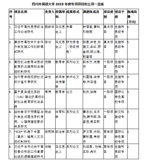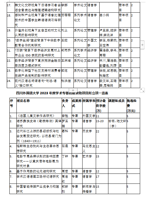 根据《四川外国语大学校级科研项目管理办法》(川外发[2021]141号)文件要求,校学术委员会于2023年6月27日下午召开会议,评选出四川外国语大学2023年度校级科研项目共计40项。拟资助校级规划项目24项(重点项目4项,一般项目9项,青年项目11项);学术专著后期资助项目8项;专项项目8项(重点项目2项,一般项目4项,青年项目2项)。