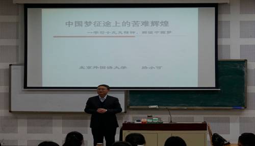 11月22日下午路老师到新区教学楼A1-2教室给2017级教育学院的同学做中国梦课堂示范教学,讲述“中国梦征途上的苦难辉煌--学习党的十九大精神,解读中国梦”。路老师从“振兴中华”、“中国梦”讲到“苦难、追梦、光荣、辉煌”,最后提到“当代学子的历史担当”。