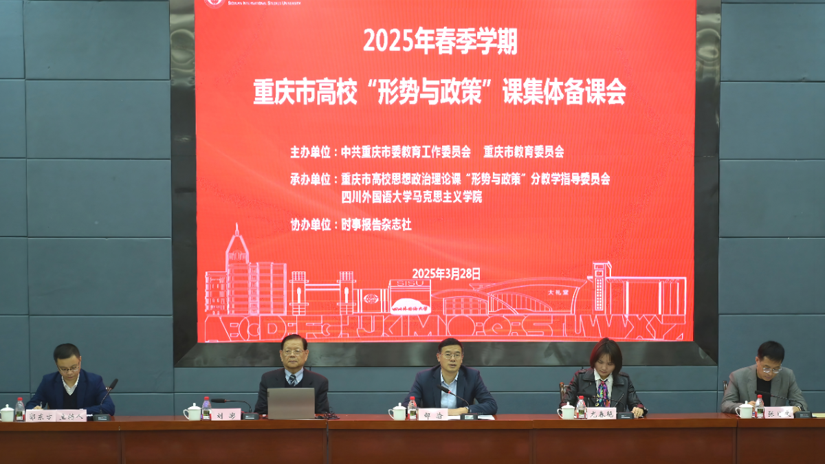 3月28日上午,2025年春季学期重庆市高校“形势与政策”课集体备课会在我校召开。本次会议由中共重庆市委教育工作委员会、重庆市教育委员会主办,重庆市高校思想政治理论课教学指导委员会“形势与政策”分教学指导委员会、太阳成集团tyc122ccvip承办,《时事报告》杂志社协办。全市各高校太阳成集团tyc122ccvip教学副院长、“形势与政策”课教研室主任、本学期任课教师代表参加会议。重庆市高校思想政治理论课教学指导委员会“形势与政策”分教学指导委员会主任委员、四川外国语大学党委书记邹渝、市教委宣教处副处长尤春艳、《时事报告(大学生版)》主编张习文、前中国社会科学院美国研究所研究员、国务院发展研究中心民族发展研究所研究员、北京外国语大学英语学院美国研究中心教授刘澎出席会议,会议由太阳成集团tyc122ccvip院长郭东方主持。