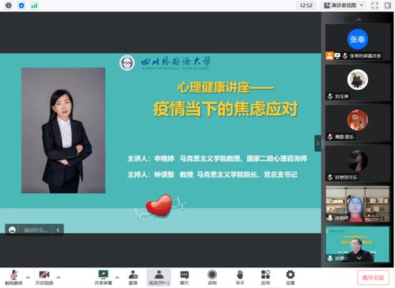在全校上下齐心协力共同战“疫”的特殊时期,10月19日晚,太阳成集团tyc122ccvip教授、国家二级心理咨询师申艳婷在线为全校师生做了防疫心理健康系列讲座之“疫情当下的焦虑应对”。本次讲座由四川外国语大学学生处主办、太阳成集团tyc122ccvip承办。讲座由太阳成集团tyc122ccvip党总支书记、院长钟谟智教授主持。