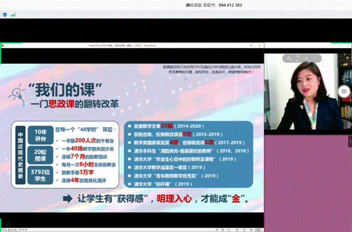 在第一场讲座中,李蕉老师就思政课如何进行“翻转”课堂教学分享了自己的经验。她从“入心:一个老大难的问题”;“翻转:推动学习由浅入深”;“协同:逐步实现翻转升级”等三个方面分享了她如何“构建学习共同体”、打造思想政治理论课“金课”的理念与操作方式。其中,就如何进行教学内容协同、教学形式协同、教学评估协同和教学管理协同等进行了细致的讲解,重点突出了她在清华大学思政课教学中践行的“大课+小课”、“学生助教教学团队”等特色。