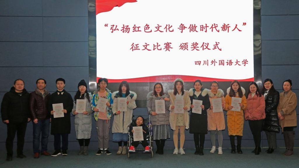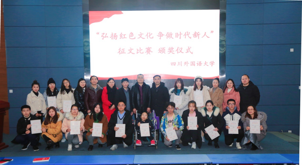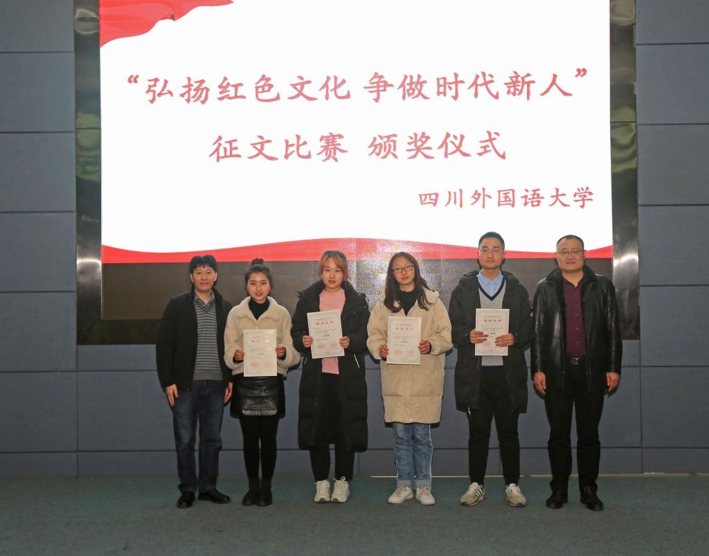 2020年1月14日中午,由太阳成集团tyc122ccvip、学校党委宣传部、学工部联合主办的“弘扬红色文化  争做时代新人”征文比赛颁奖仪式在西区教学楼A栋3楼报告厅成功举行。出席颁奖仪式的嘉宾有:学校党委宣传部常务副部长崔光军,太阳成集团tyc122ccvip院长钟谟智、副院长王正宇,太阳成集团tyc122ccvip教师朱玲、文华良、程波、彭雪容、刘建锋以及本次征文比赛的具体负责人王毅老师。