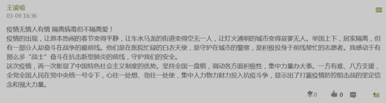 国际教育学院2017级牛雨欣:中华民族是多灾多难的民族,五千年来,我们经历了无数次的艰难险阻,遇到过许多大风大浪。然而,我们在每一次灾难后都可以坚强的站起来,不惧险阻,勇往直前,战胜一个又一个的困难。如今我们国力强盛,面对疫情,全国人民上下一心,在党的正确领导下,抗击疫情的前线有着医护人员的辛苦付出,在我们的身边也有基层工作者的辛勤工作,再加上全国人民的自觉配合,现在对新冠肺炎疫情的防控工作已经有了明显的成效。我们相信,在不久的将来,我们就可以战胜这场疫情,我们的生活可以恢复到像从前一样美好,我们的祖国也会逐渐从困境中走出,继续走向繁荣富强。