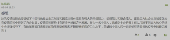 2019级硕士生朱俊光:抗“疫”彰显了中国特色社会主义的制度优势:第一,彰显了党的集中统一领导制度的显著优势。第二,彰显了人民当家作主的政治制度的显著优势。第三,彰显了社会主义基本经济制度的显著优势。第三,彰显了繁荣发展社会主义先进文化的显著优势。