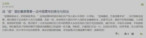 2019级硕士生赵琪玮:在这场战“疫”中,中国特色社会主义制度集中力量办大事的显著优势得到充分体现。中国对于疫情的有力防控也为世界各国树立了典范。在党中央的坚强领导下,我们一定可以打好、打赢这场战“疫”。