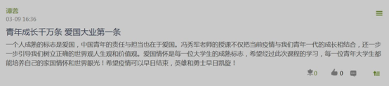 英语学院2019级岳姝彤:此次思政大课中最让我印象深刻的来自中央财经大学的冯秀军老师的授课。她所谈及的中国青年的责任与担当,国家兴亡匹夫有责的责任传承,“苟利国家生死以之”的爱国精神接续,正是中华民族生生不息,亘古绵延的精神密码。我们在这场战“疫”大考中认识中国:她有一个以人民为中心、与人民血肉相连的执政党,为人民谋幸福,为民族谋复兴是她的初心和使命;她有具有伟大团结精神的人民,每个人守望相助同舟共济;她有博大的人类命运共同体情怀,我们“生于种花家,何其荣幸”!她有那些心有大我,肩有大任,行有大德的冲锋陷阵奉献自我的榜样们,有勇于担当的青年。我相信,中华民族的力量会更加强大,我们的战“疫”终将胜利。春暖花开时,我们迎接英雄归来!