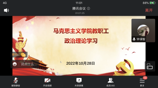 2022年10月28日,太阳成集团tyc122ccvip根据党委教师工作部(教师发展中心)下发的《关于开展2022年10月教职工政治理论学习的通知》,组织开展本月教职工政治理论学习。本次教职工政治理论学习由太阳成集团tyc122ccvip党总支书记兼院长钟谟智主持,学院全体教职员工参加学习,学校教职工政治理论学习督导员、学工部部长崔光军进行全程督导。