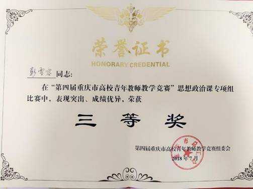 7月5日,我院彭雪容老师在第四届重庆市高校青年教师教学竞赛中喜获佳绩。我校获“优秀组织奖”。