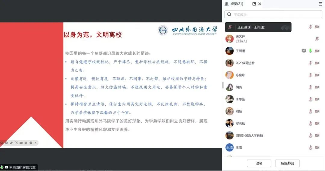 其次,王雨潇老师与毕业生一起回忆过去三年的求学时光,并强调校规校纪,希望同学们做到文明离校。同时,她号召同学们在毕业之际用实际行动展现川外马院学子的美好形象,为学弟学妹们树立良好榜样,展现毕业生良好的精神风貌和文明素养。