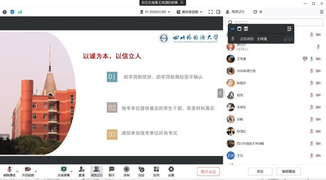 此次主题教育共分为诚信教育、文明离校教育、安全教育三个部分。首先,王雨潇老师就助学贷款续贷、助学贷款离校签字确认等流程进行了详细讲解,并围绕诚信报考引导学生深刻认识诚信的基本内涵,提升学生的诚信意识和责任意识。