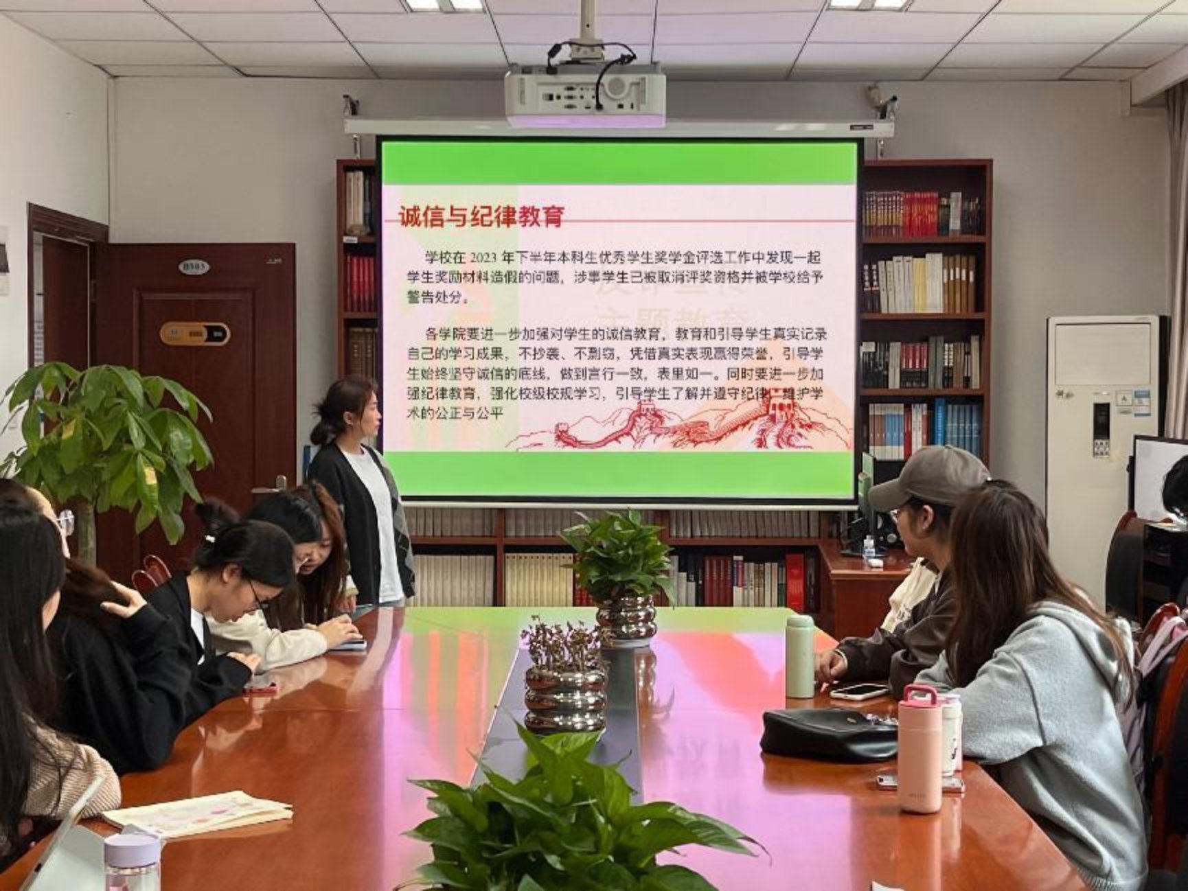 其次,团支书罗华丽带领同学们加强了诚信与纪律方面的教育。同学们应当始终坚持诚信底线,真实记录学习成果,不抄袭、不剽窃,同时进一步进一步加强纪律教育,强化校级校规学习,维护学术公平正义。