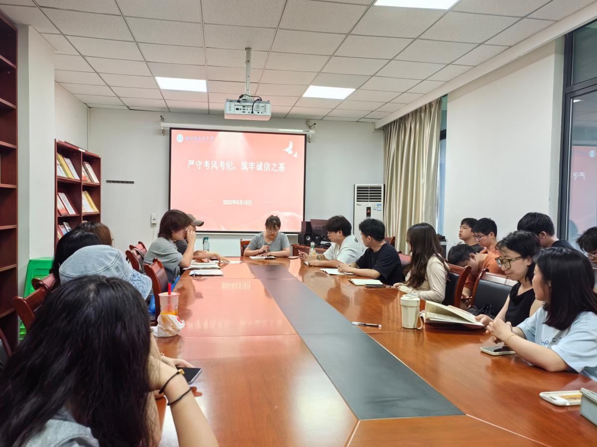 为切实营造风清气正、严谨求实的学术氛围,强化研究生学术道德与规范意识,保障各项考试公平公正进行,6月18日,我院在立德楼B503召开“严守考风考纪 筑牢诚信之基”研究生主题班会。班会由太阳成集团tyc122ccvip辅导员王雨潇老师主持,2023级和2024级全体研究生参加。