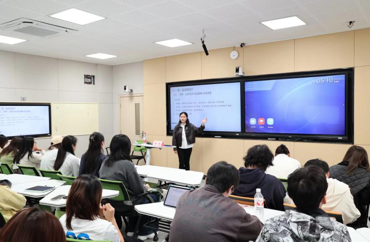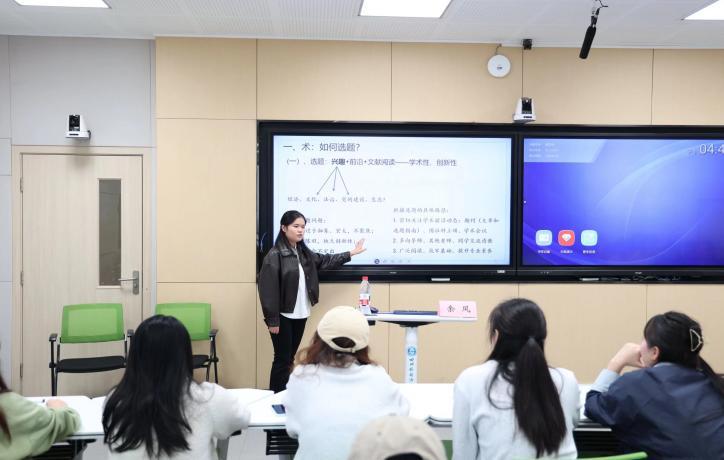 在“术”的层面,余凤系统拆解了科研创作的完整链条。在选题环节,她分享了如何从阅读中发现问题、从众多领域中找到感兴趣的方向,以及如何判断一个选题的研究价值与可行性,为尚在选题迷茫期的同学指明了方向。在文献阅读环节,她介绍了高效的文献检索路径与核心文献提炼方法,帮助同学们摆脱“文献海洋”的困扰。在构思环节,她以具体的一篇论文题目为例,带领同学们梳理思路并一步一步搭建起论文框架。在写作环节,她重点讲解了各种论证方法、论证逻辑常见误区以及语言表达的学术规范性,让同学们对如何下笔、如何写好论文有了更清晰的认识。如果说“术”是科研的舟楫,那么“道”则是航行的罗盘。在“道”的层面,余凤结合自身的科研经历,生动阐述了何为科研人的脚踏实地与深耕厚植。她谈到,科研之路没有捷径,唯有保持严谨求实的态度、坐得住“冷板凳”的耐心,以及对所研究领域真诚的热爱,才能厚积薄发,产出真正有价值的成果。