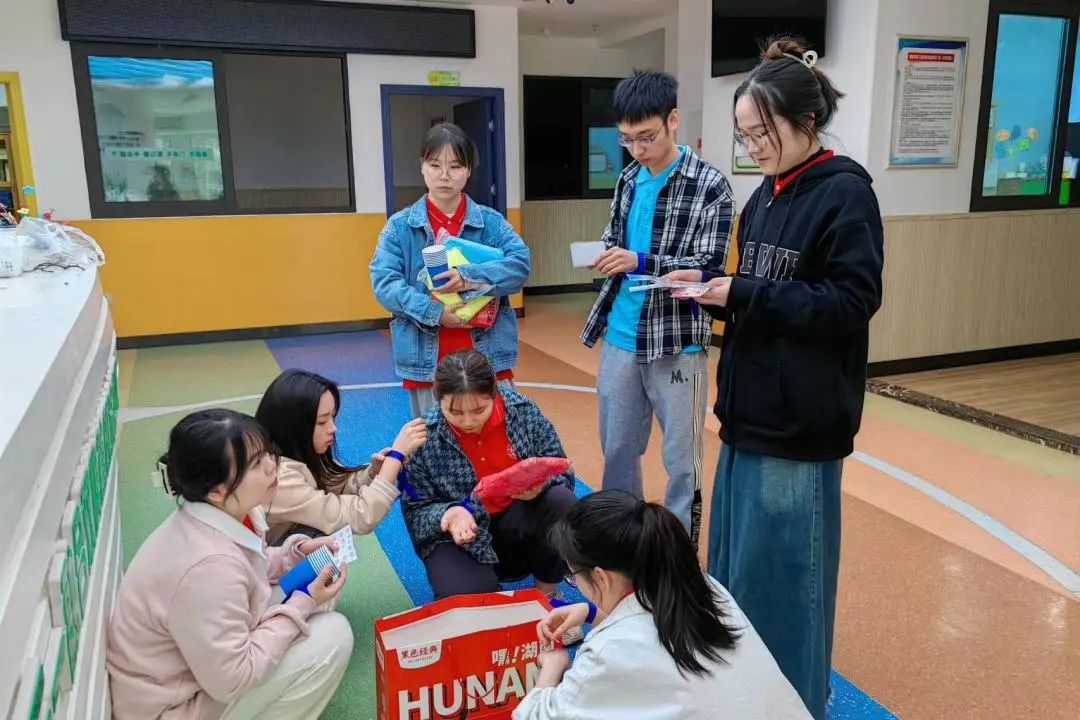 本次志愿活动分为室内教学和室外活动。室内活动主要由6名同学担任班级教师,带领小朋友用树枝、杯子等简单材料制作手工盆栽。其余同学进行室外活动,在阳光下与小朋友进行套圈、传球等运动。