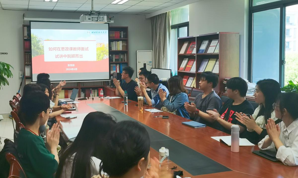 4月28日上午,我院思政课优秀教师彭雪容就“如何在面试试讲环节脱颖而出”为题,与同学们分享经验、展开探讨。此次活动由我院团总支书记、辅导员王雨潇老师主持,部分研究生参加。